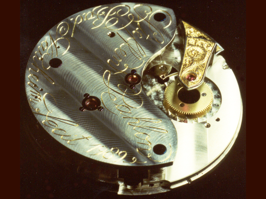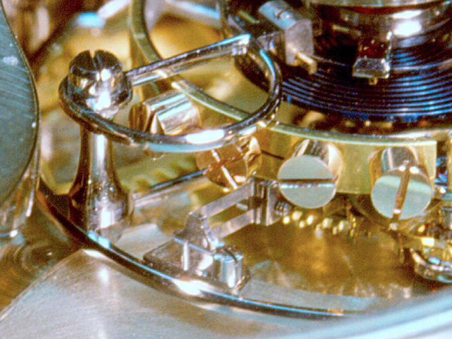 Minuten - Tourbillon, Chronometerhemmung mit Feder auf Druck beansprucht, Neusilberwerk, 17 Steine, mit Schnecke und Kette, 30 Stunden Gangdauer, mit Auf- und Abwerk, mit Wechselradkloben, Glashuetter Kompensations - Unruhe, Spirale aus Stahl mit Endkurve nach Gerstenberger, Gangfeder mit Laterne, Gangrad aus Gold.