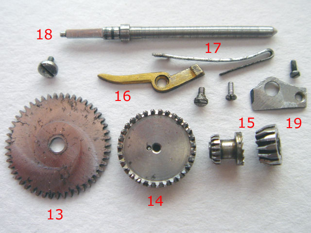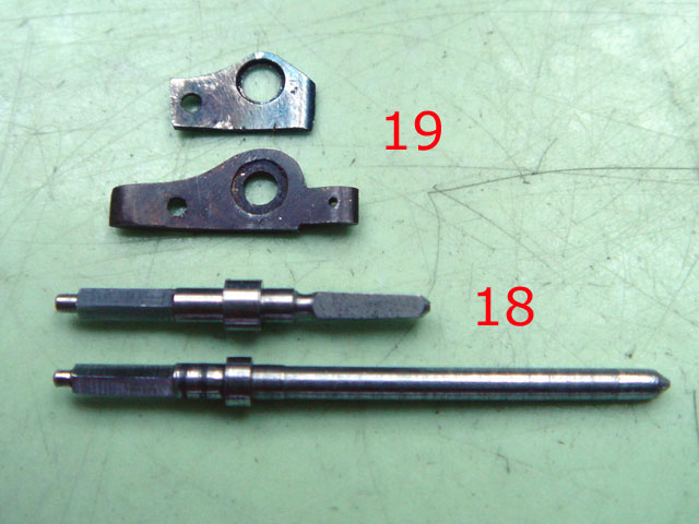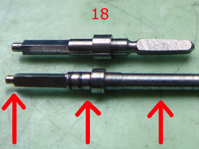 (18) die Aufziehwelle, ihr Ansatz zu kurz, ihr Zapfen zu dünn, der Vierkant zur Kronenaufnahme nicht
