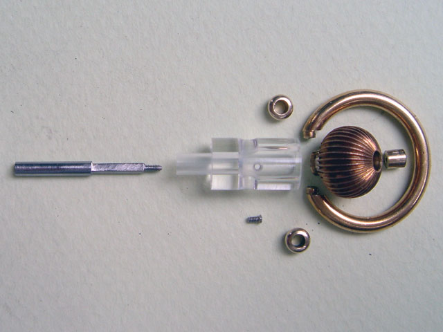 Das Detail besteht aus dem Bügel, der Krone, dem Druckknopf, dem Rohr im Pendant und weiterer Kleinteile. Da solche Teile nicht vorrätig sind, müssen sie angefertigt und passend gearbeitet werden. Eine vorhandene Krone wurde aufgebohrt, um den Druckknopf einzurichten. Zwei Futter sind nötig, da der Bügel nicht direkt im Acrylglas lagern darf, wegen der Beanspruchung. Das Rohr hat einen Innenvierkant.