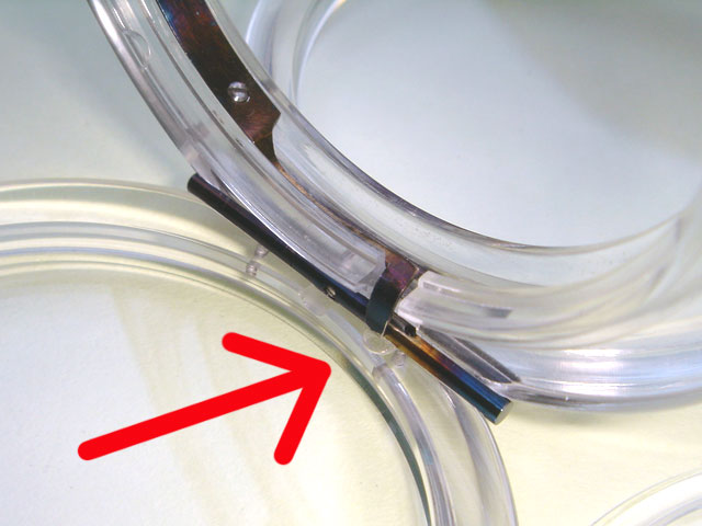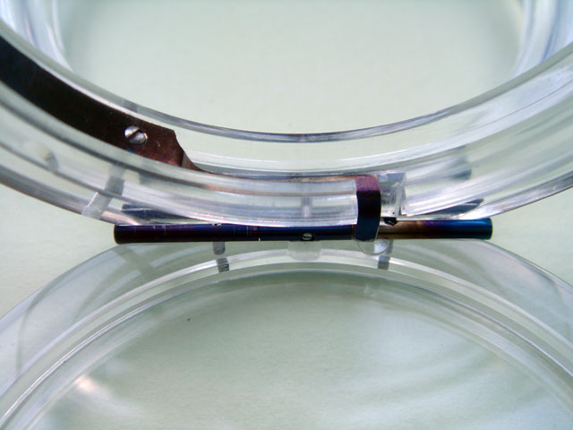 Eine weitere Feder welche den Gehäusedeckel eines Savonette-Gehäuses aufdrückt, war anzufertigen. In einer Ausfräsung lagert diese Feder und wird mit einer Schraube befestigt. Zu beachten ist, dass der Reifen für das Savonettglas, der ja über der Feder lagert, der Feder freien Raum läßt. Die kleine Nase, die den Gehäusedeckel drückt, muß sich frei bewegen lassen. Ein besonderes Detail ist hier bei einem Acrylglas-Gehäuse auszuführen. Der Punkt wo die Nase der Feder drückt bekommt einen Deckstein.